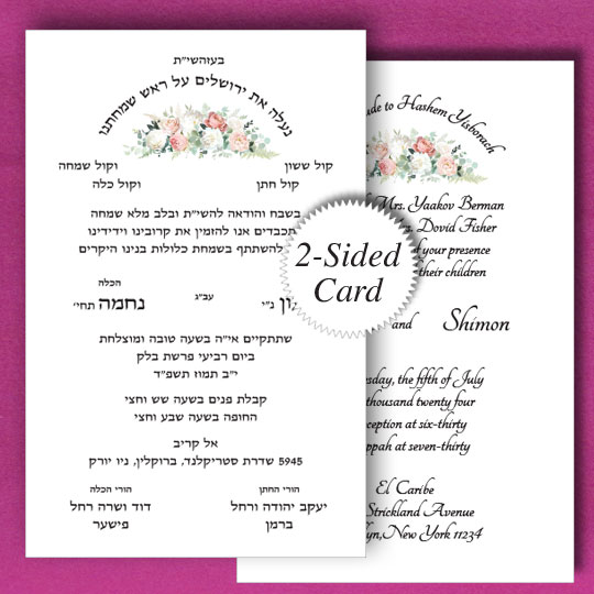Enjoy this stunning new look in the updated two sided format. Use as shown or suggest something of your own. Also available as 2 separate cards for less. See previous item Rich Gold Design for pricing. Jewish Hebrew English wedding invitations