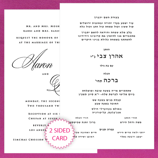 Both the Hebrew font choices and the English font choices have separate categories for selecting a font. One category is for selecting a font for the general text and one category is for selecting a font for the names of the Chosson and Kallah. This way you can be truly creative in setting a personal touch to your invitation. Alternatively, you can request that we select the perfect fonts for you.