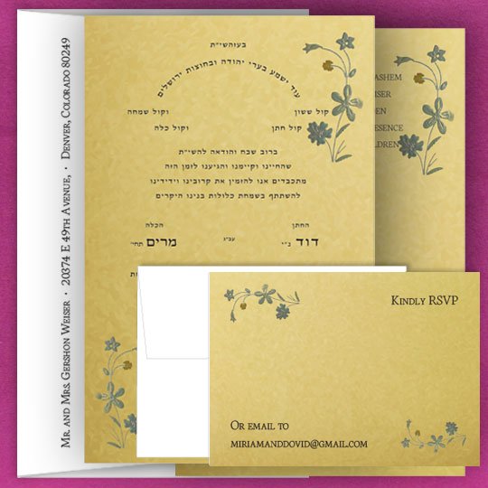 Color is in! Enjoy the elegance of a little watercolor along with the royalty of a gold background. Order as shown or suggest a design of your own. Jewish Hebrew English Wedding invitations