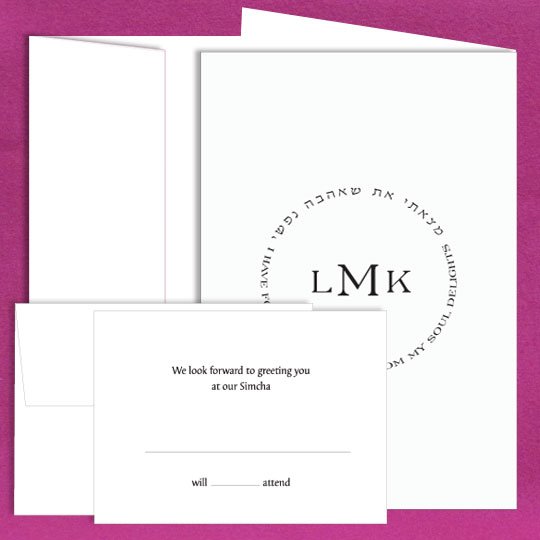 Flat Print! Combine a monogram with a phrase in a circle and you will have the perfect up to the minute latest design. Jewish wedding invitations
