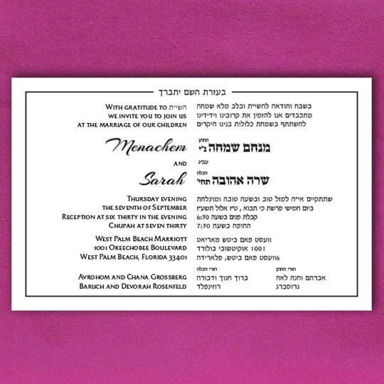 The modern look of a single card with the full hebrew and english text set in beautifully set with sharp prints. Jewish wedding invitations