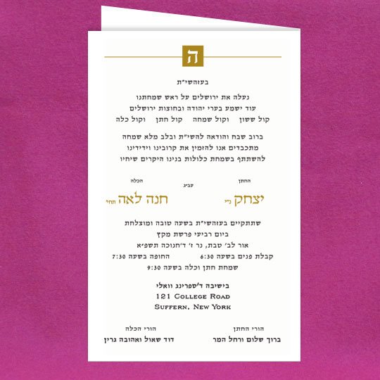 A popular design with an extra touch of gold on top to enhance that very special upcoming day! Jewish Hebrew English wedding invitations